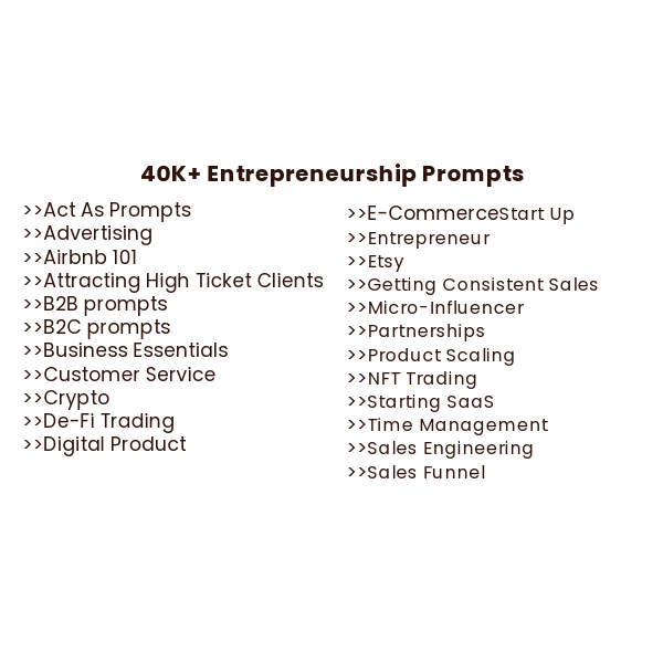 1. Over 40,000 carefully curated prompts for various topics such as Advertising & Marketing Airbnb 101, B2B and B2C Business Solutions, Attracting High-Ticket Clients, Customer Service Essentials, Digital Products & E-commerce, Crypto, NFT Trading, and De-Fi Strategies, Sales Funnels, Scaling, SaaS Startups and Sales Engineering.